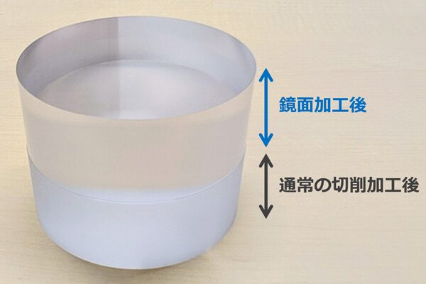 プラスチック素材の切削加工を行うと、加工面に微細な凹凸ができるため、アクリルなどの透明な素材でも表面が曇ってしまうことが一般的です。そのため、滑らかな表面を実現するためには、切削加工後の仕上げとして研磨を行う必要があり、ポリカーボネートのような柔らかく研磨に適さない素材は科学的な仕上げ処理を行う必要がありました。